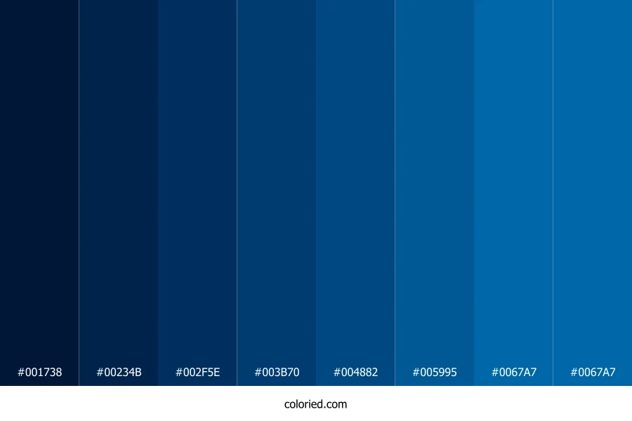 ![]() | #001738 | 0, 23, 56 | 215, 100%, 11% | 100%, 59%, 0%, 78% | oklch(0.210 0.072 256) |