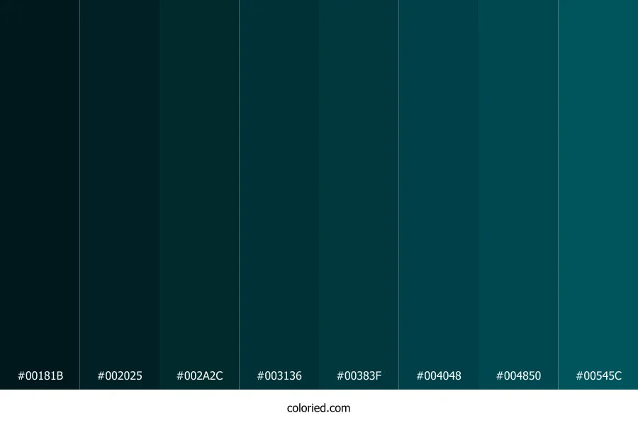 | #002025 | 0, 32, 37 | 188, 100%, 7% | 100%, 14%, 0%, 85% | oklch(0.223 0.039 210) | |