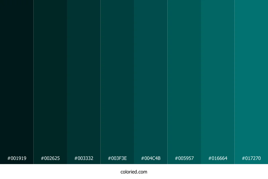 | #017270 | 1, 114, 112 | 179, 98%, 23% | 99%, 0%, 2%, 55% | oklch(0.499 0.085 193) |