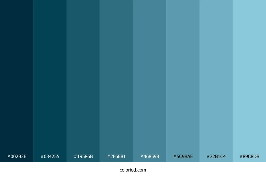 ![]() | #002B3E | 0, 43, 62 | 198, 100%, 12% | 100%, 31%, 0%, 76% | oklch(0.272 0.057 233) |