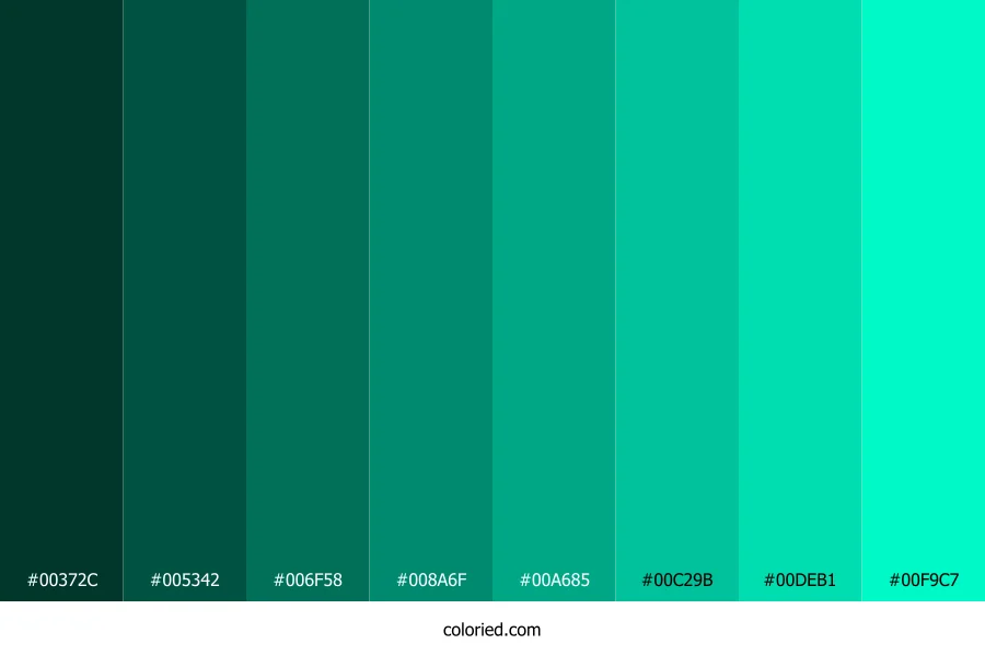 ![]() | #00372C | 0, 55, 44 | 168, 100%, 11% | 100%, 0%, 20%, 78% | oklch(0.301 0.057 175) |