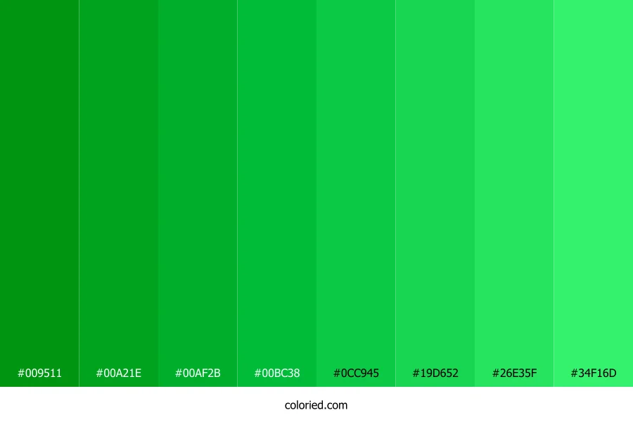 | #00BC38 | 0, 188, 56 | 138, 100%, 37% | 100%, 0%, 70%, 26% | oklch(0.692 0.215 145) | |
