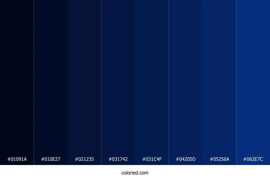 ![]() | #01091A | 1, 9, 26 | 221, 93%, 5% | 96%, 65%, 0%, 90% | oklch(0.141 0.041 256) |