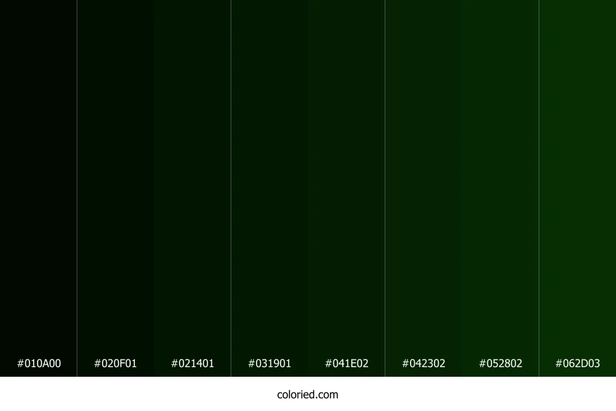 | #020F01 | 2, 15, 1 | 116, 88%, 3% | 87%, 0%, 93%, 94% | oklch(0.149 0.043 141) | |