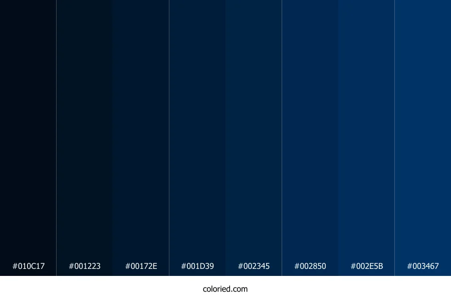 | #001223 | 0, 18, 35 | 209, 100%, 7% | 100%, 49%, 0%, 86% | oklch(0.176 0.045 246) | |