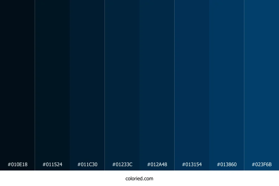 | #011524 | 1, 21, 36 | 206, 95%, 7% | 97%, 42%, 0%, 86% | oklch(0.187 0.042 242) | |
