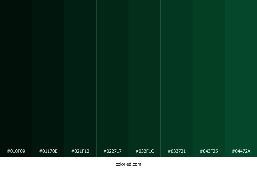 ![]() | #010F09 | 1, 15, 9 | 154, 88%, 3% | 93%, 0%, 40%, 94% | oklch(0.151 0.028 168) |