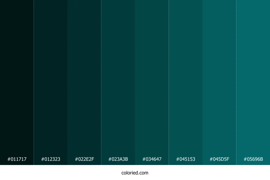 ![]() | #011717 | 1, 23, 23 | 180, 92%, 5% | 96%, 0%, 0%, 91% | oklch(0.186 0.030 195) |