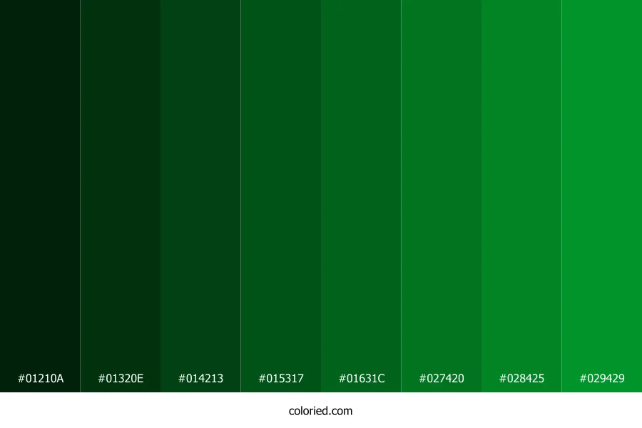 ![]() | #01210A | 1, 33, 10 | 137, 94%, 7% | 97%, 0%, 70%, 87% | oklch(0.217 0.058 150) |