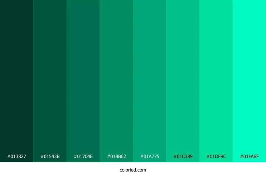 | #01DF9C | 1, 223, 156 | 162, 99%, 44% | 100%, 0%, 30%, 13% | oklch(0.799 0.173 163) | |