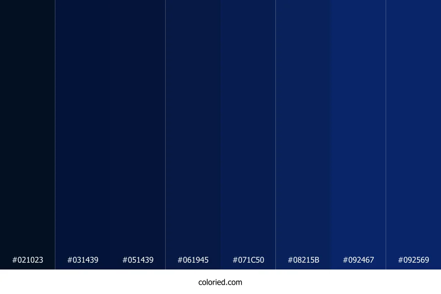 ![]() | #021023 | 2, 16, 35 | 215, 89%, 7% | 94%, 54%, 0%, 86% | oklch(0.172 0.046 253) |
