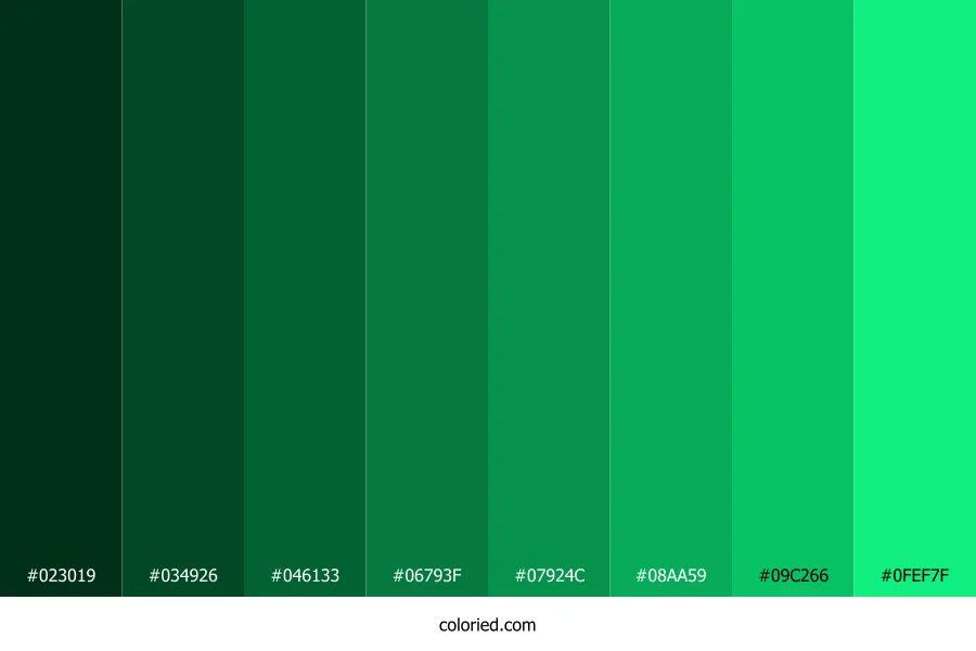 ![]() | #023019 | 2, 48, 25 | 150, 92%, 10% | 96%, 0%, 48%, 81% | oklch(0.273 0.064 156) |