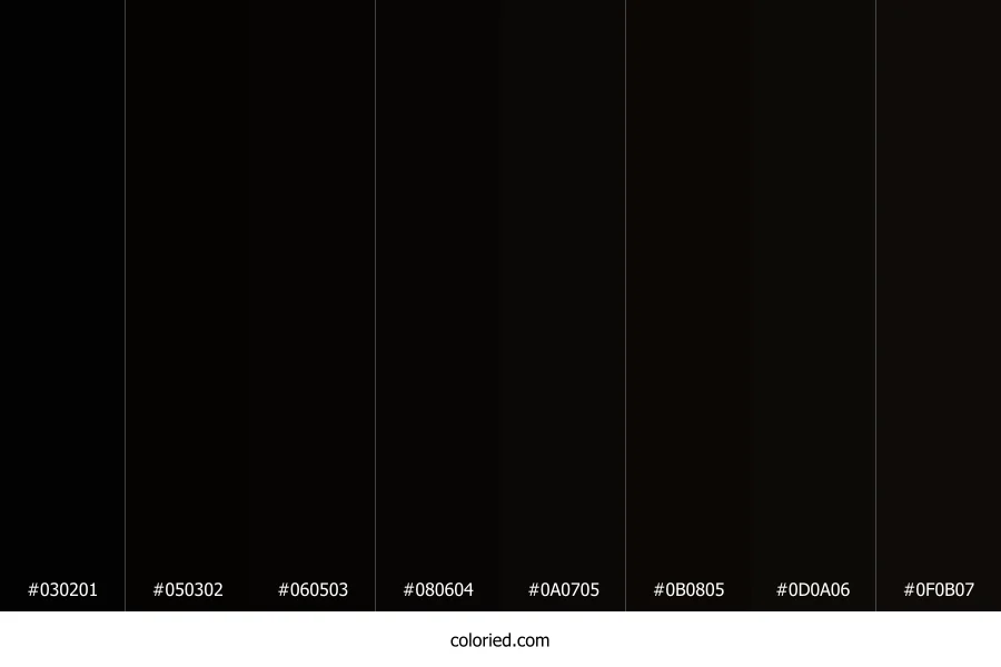 | #0B0805 | 11, 8, 5 | 30, 38%, 3% | 0%, 27%, 55%, 96% | oklch(0.137 0.010 73) | |