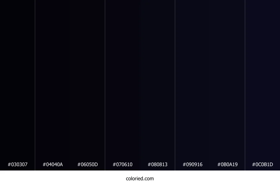 ![]() | #030307 | 3, 3, 7 | 240, 40%, 2% | 57%, 57%, 0%, 97% | oklch(0.101 0.015 283) |
