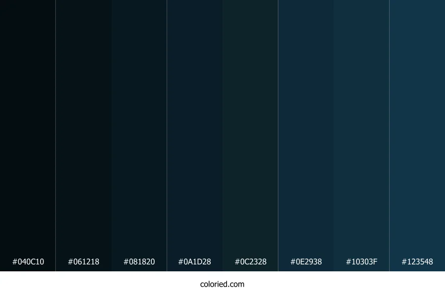 | #081820 | 8, 24, 32 | 200, 60%, 8% | 75%, 25%, 0%, 87% | oklch(0.199 0.027 232) | |