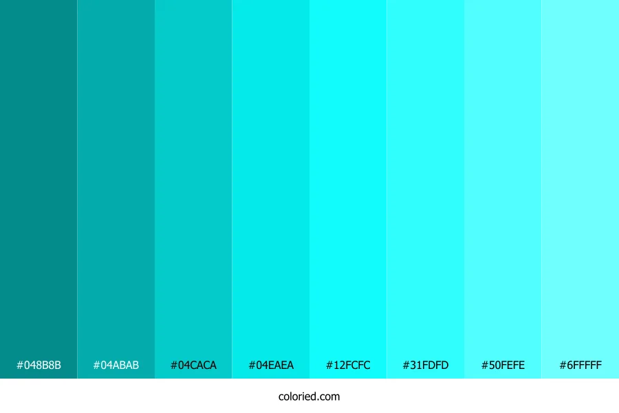 | #04EAEA | 4, 234, 234 | 180, 97%, 47% | 98%, 0%, 0%, 8% | oklch(0.849 0.145 195) | |