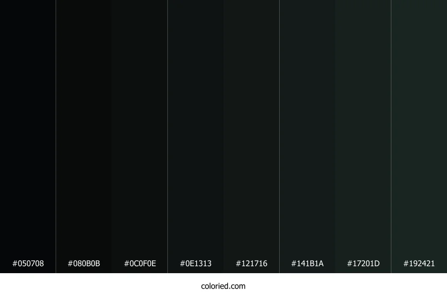 | #080B0B | 8, 11, 11 | 180, 16%, 4% | 27%, 0%, 0%, 96% | oklch(0.146 0.005 197) | |