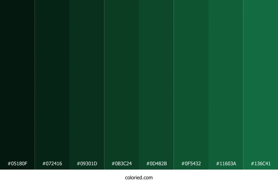 ![]() | #05180F | 5, 24, 15 | 152, 66%, 6% | 79%, 0%, 37%, 91% | oklch(0.189 0.032 162) |