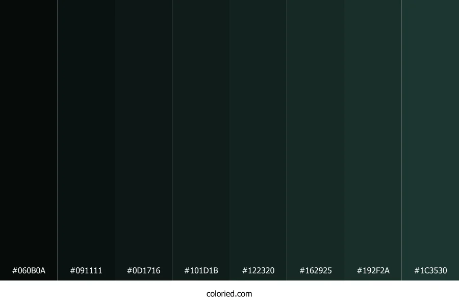 | #0D1716 | 13, 23, 22 | 174, 28%, 7% | 43%, 0%, 4%, 91% | oklch(0.194 0.015 188) | |