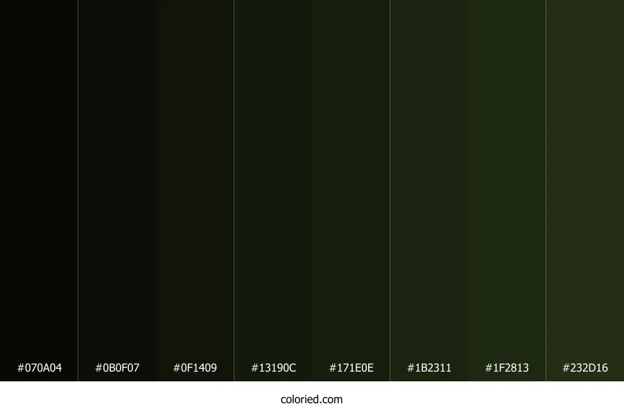 ![]() | #070A04 | 7, 10, 4 | 90, 43%, 3% | 30%, 0%, 60%, 96% | oklch(0.138 0.017 128) |