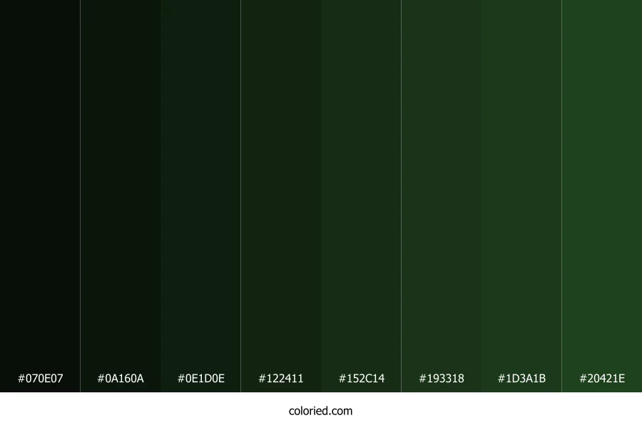 | #0E1D0E | 14, 29, 14 | 120, 35%, 8% | 52%, 0%, 52%, 89% | oklch(0.212 0.036 144) | |