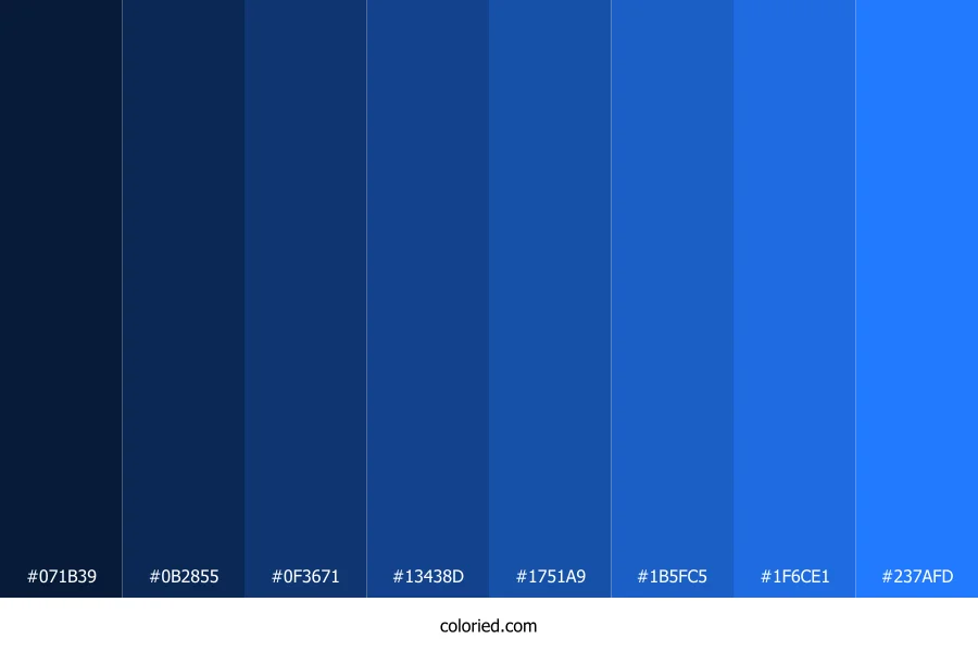 | #1B5FC5 | 27, 95, 197 | 216, 76%, 44% | 86%, 52%, 0%, 23% | oklch(0.505 0.173 259) | |
