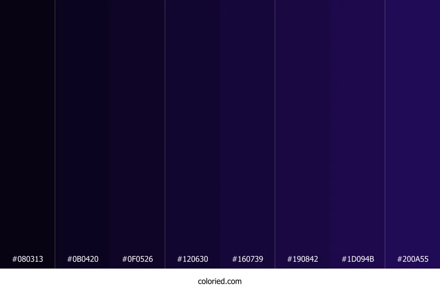 ![]() | #080313 | 8, 3, 19 | 259, 73%, 4% | 58%, 84%, 0%, 93% | oklch(0.122 0.040 299) |