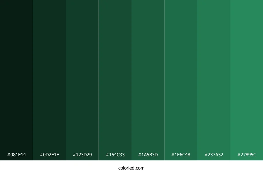 ![]() | #081E14 | 8, 30, 20 | 153, 58%, 7% | 73%, 0%, 33%, 88% | oklch(0.213 0.035 162) |
