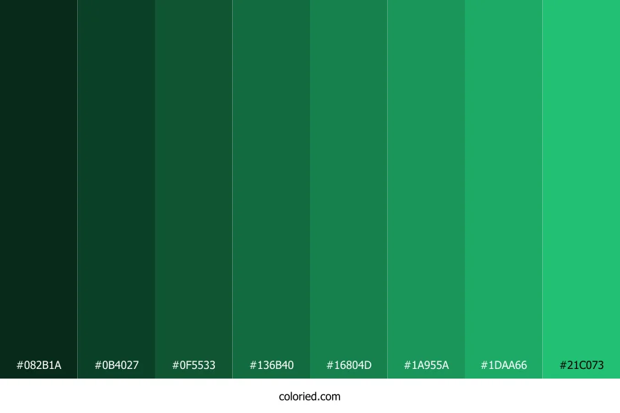 ![]() | #082B1A | 8, 43, 26 | 151, 69%, 10% | 81%, 0%, 40%, 83% | oklch(0.259 0.051 158) |