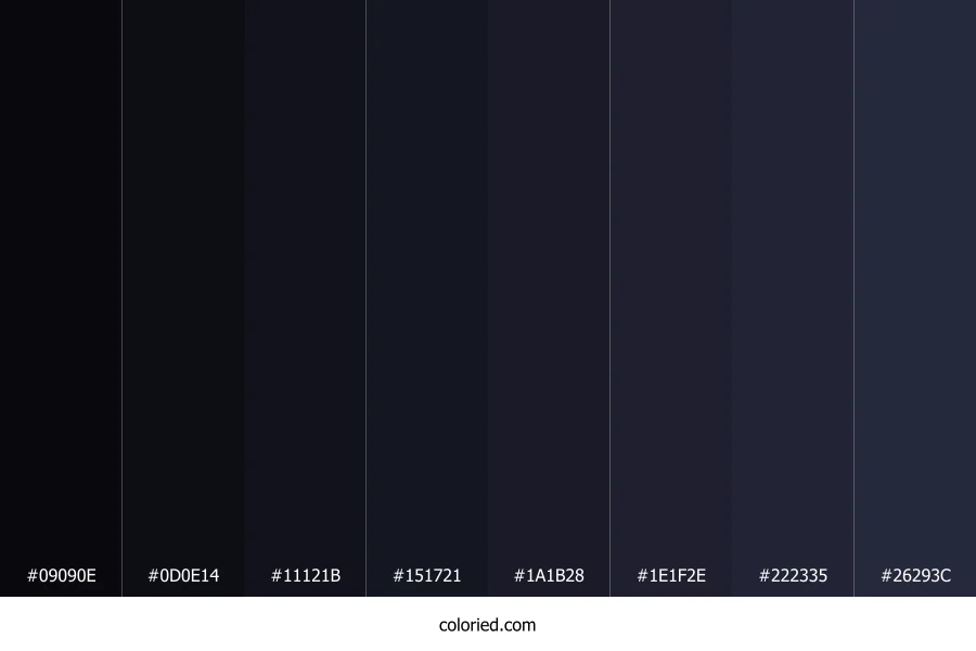 | #11121B | 17, 18, 27 | 234, 23%, 9% | 37%, 33%, 0%, 89% | oklch(0.186 0.018 279) | |