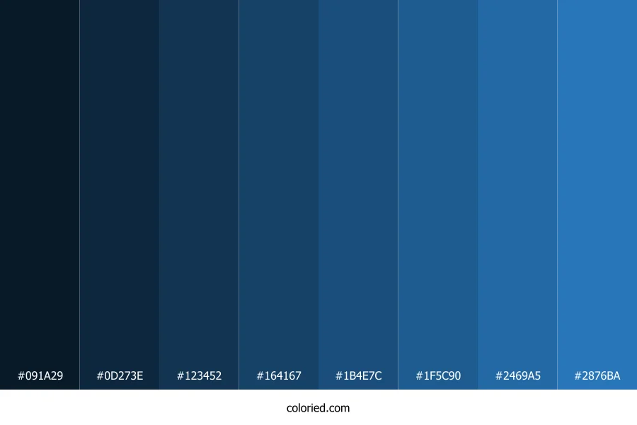 ![]() | #091A29 | 9, 26, 41 | 208, 64%, 10% | 78%, 37%, 0%, 84% | oklch(0.212 0.038 247) |