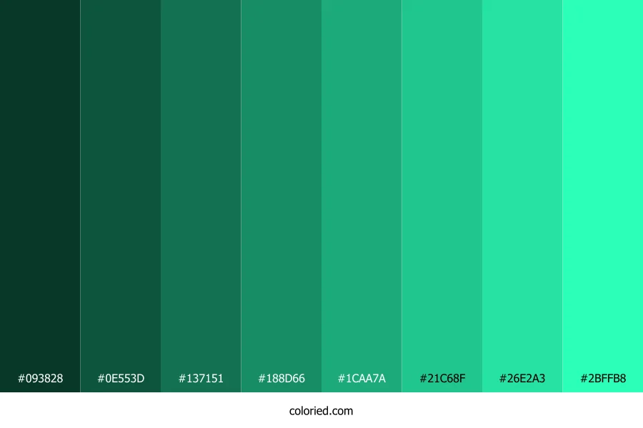 ![]() | #093828 | 9, 56, 40 | 160, 72%, 13% | 84%, 0%, 29%, 78% | oklch(0.305 0.057 166) |