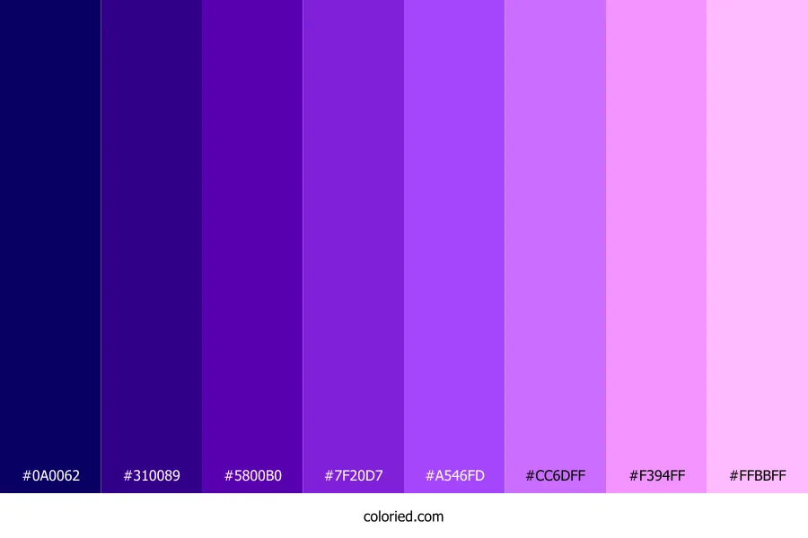 | #F394FF | 243, 148, 255 | 293, 100%, 79% | 5%, 42%, 0%, 0% | oklch(0.801 0.176 323) | |