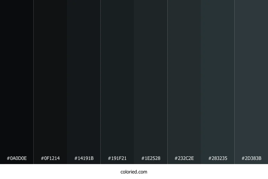 | #1E2528 | 30, 37, 40 | 198, 14%, 14% | 25%, 7%, 0%, 84% | oklch(0.259 0.012 226) | |