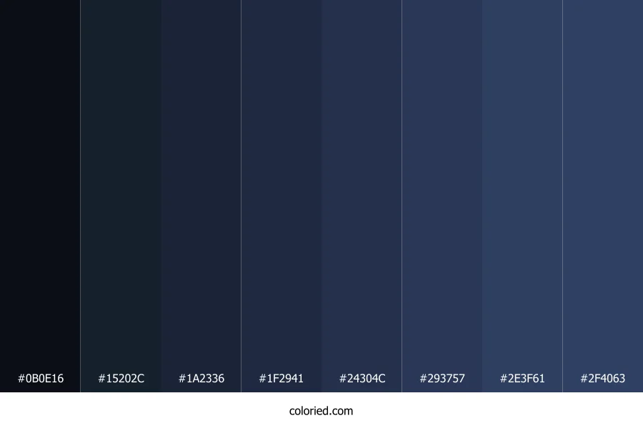 | #24304C | 36, 48, 76 | 222, 36%, 22% | 53%, 37%, 0%, 70% | oklch(0.312 0.053 266) | |