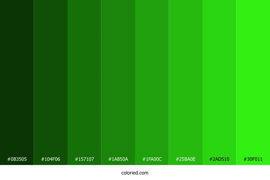 | #30F011 | 48, 240, 17 | 112, 88%, 50% | 80%, 0%, 93%, 6% | oklch(0.832 0.274 142) |