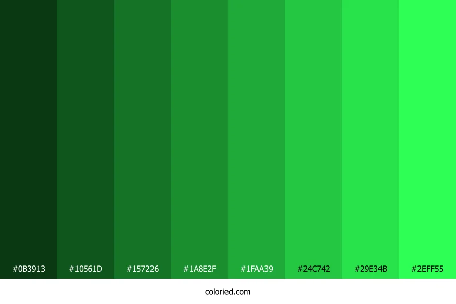 ![]() | #0B3913 | 11, 57, 19 | 130, 68%, 13% | 81%, 0%, 67%, 78% | oklch(0.304 0.081 146) |