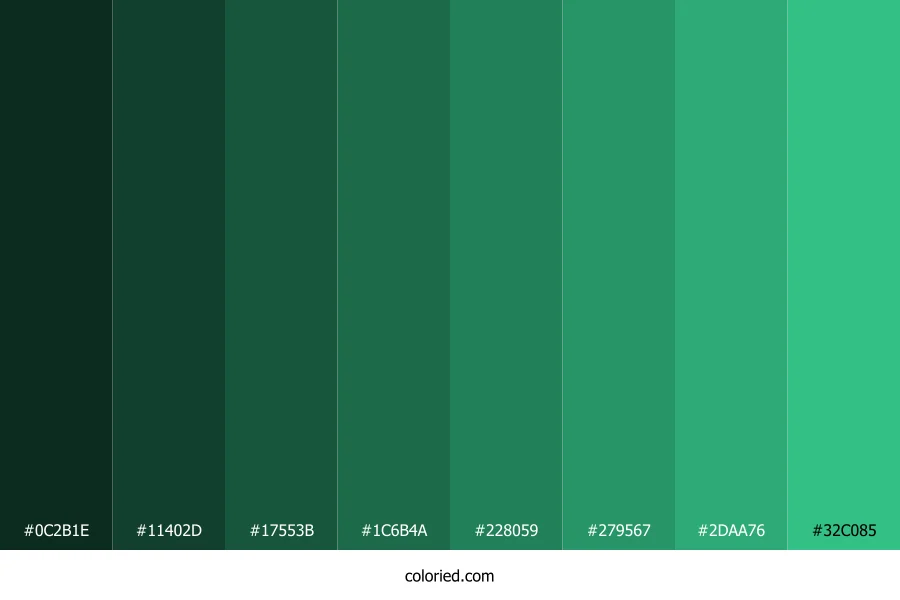 ![]() | #0C2B1E | 12, 43, 30 | 155, 56%, 11% | 72%, 0%, 30%, 83% | oklch(0.261 0.044 163) |