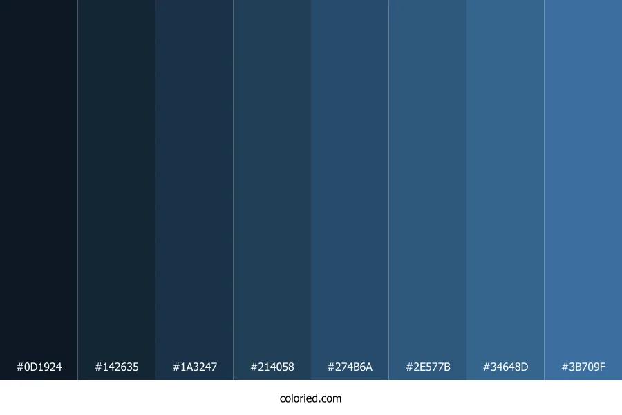 ![]() | #0D1924 | 13, 25, 36 | 209, 47%, 10% | 64%, 31%, 0%, 86% | oklch(0.208 0.028 247) |