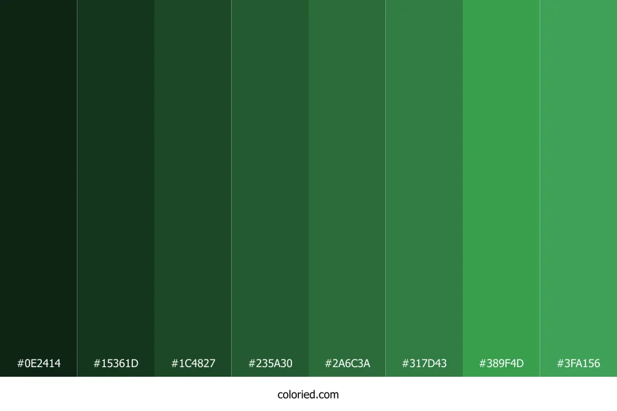 ![]() | #0E2414 | 14, 36, 20 | 136, 44%, 10% | 61%, 0%, 44%, 86% | oklch(0.237 0.042 151) |