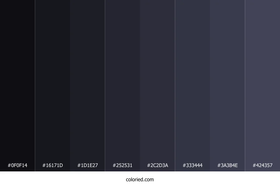 | #1D1E27 | 29, 30, 39 | 234, 15%, 13% | 26%, 23%, 0%, 85% | oklch(0.238 0.017 280) | |
