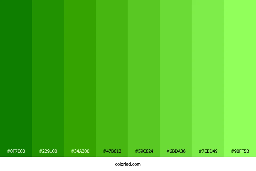 ![]() | #0F7E00 | 15, 126, 0 | 113, 100%, 25% | 88%, 0%, 100%, 51% | oklch(0.515 0.173 142) |
