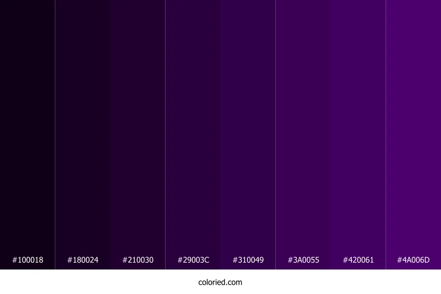 | #180024 | 24, 0, 36 | 280, 100%, 7% | 33%, 100%, 0%, 86% | oklch(0.158 0.079 313) | |