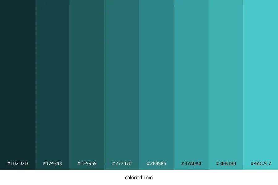 ![]() | #102D2D | 16, 45, 45 | 180, 48%, 12% | 64%, 0%, 0%, 82% | oklch(0.275 0.035 195) |