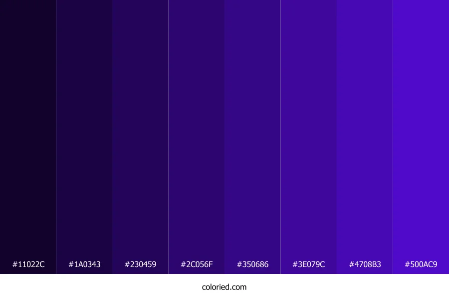 ![]() | #11022C | 17, 2, 44 | 261, 91%, 9% | 61%, 95%, 0%, 83% | oklch(0.161 0.081 293) |