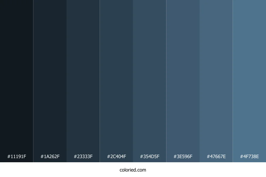 ![]() | #11191F | 17, 25, 31 | 206, 29%, 9% | 45%, 19%, 0%, 88% | oklch(0.208 0.017 241) |