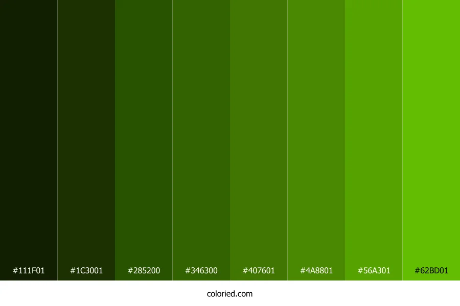 ![]() | #111F01 | 17, 31, 1 | 88, 94%, 6% | 45%, 0%, 97%, 88% | oklch(0.218 0.057 130) |