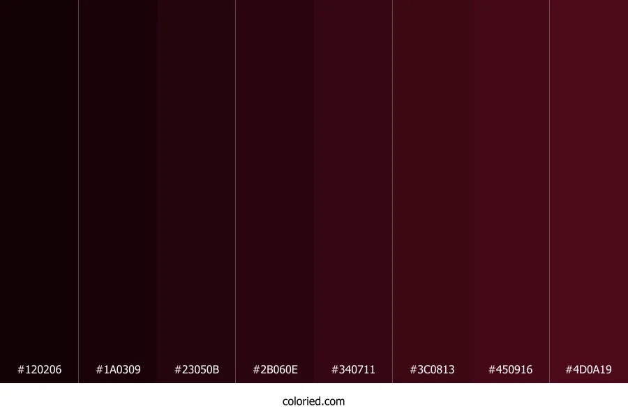| #1A0309 | 26, 3, 9 | 344, 79%, 6% | 0%, 88%, 65%, 90% | oklch(0.151 0.046 4) | |