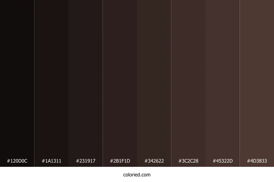 | #45322D | 69, 50, 45 | 12, 21%, 22% | 0%, 28%, 35%, 73% | oklch(0.337 0.029 35) | |
