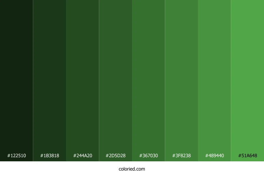 | #244A20 | 36, 74, 32 | 114, 40%, 21% | 51%, 0%, 57%, 71% | oklch(0.369 0.081 142) | |